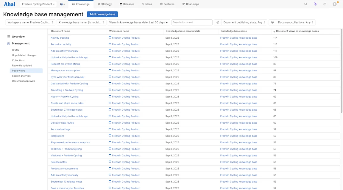 Use built-in knowledge base reports in Aha! Knowledge to understand what documentation people actually use and prioritize updates.