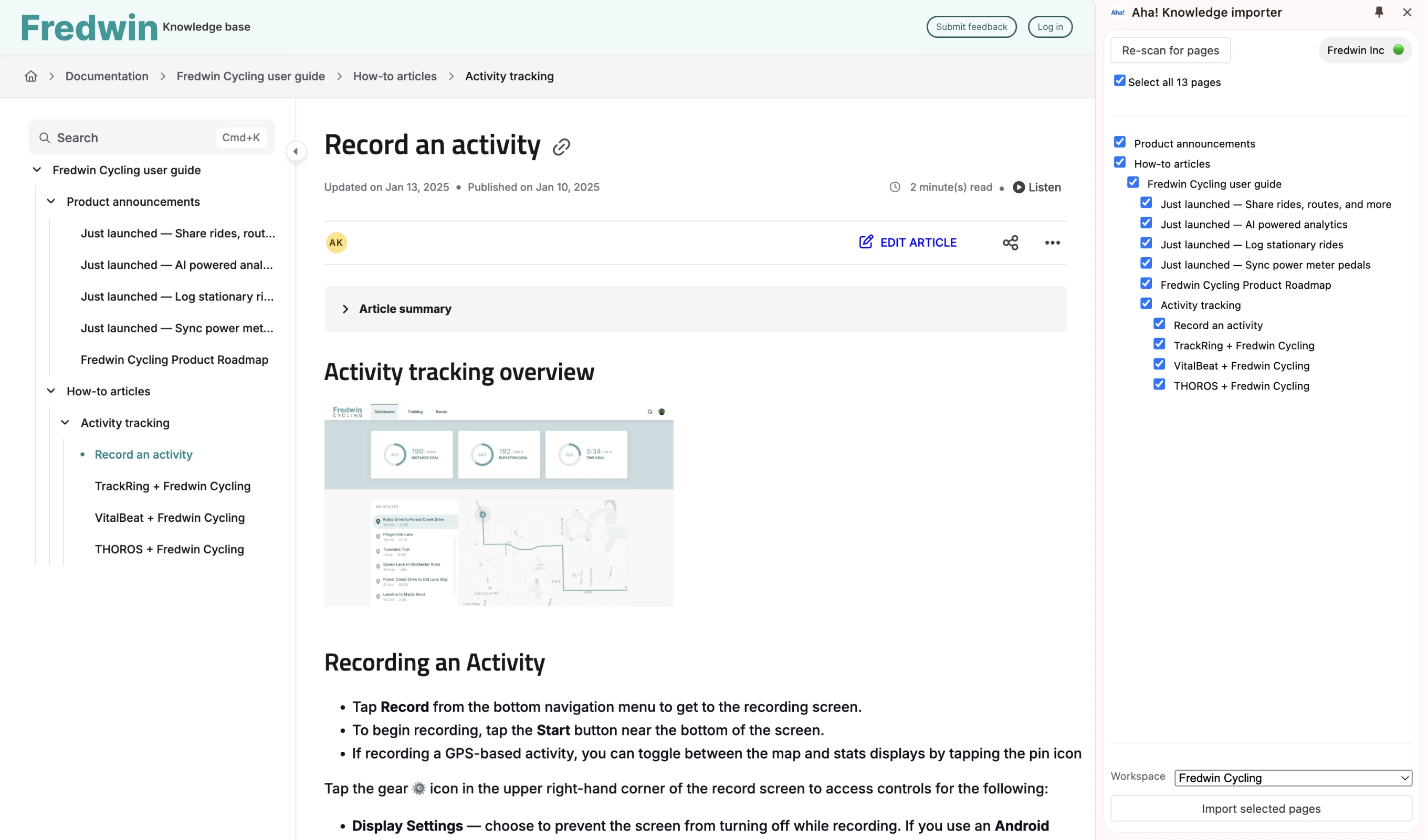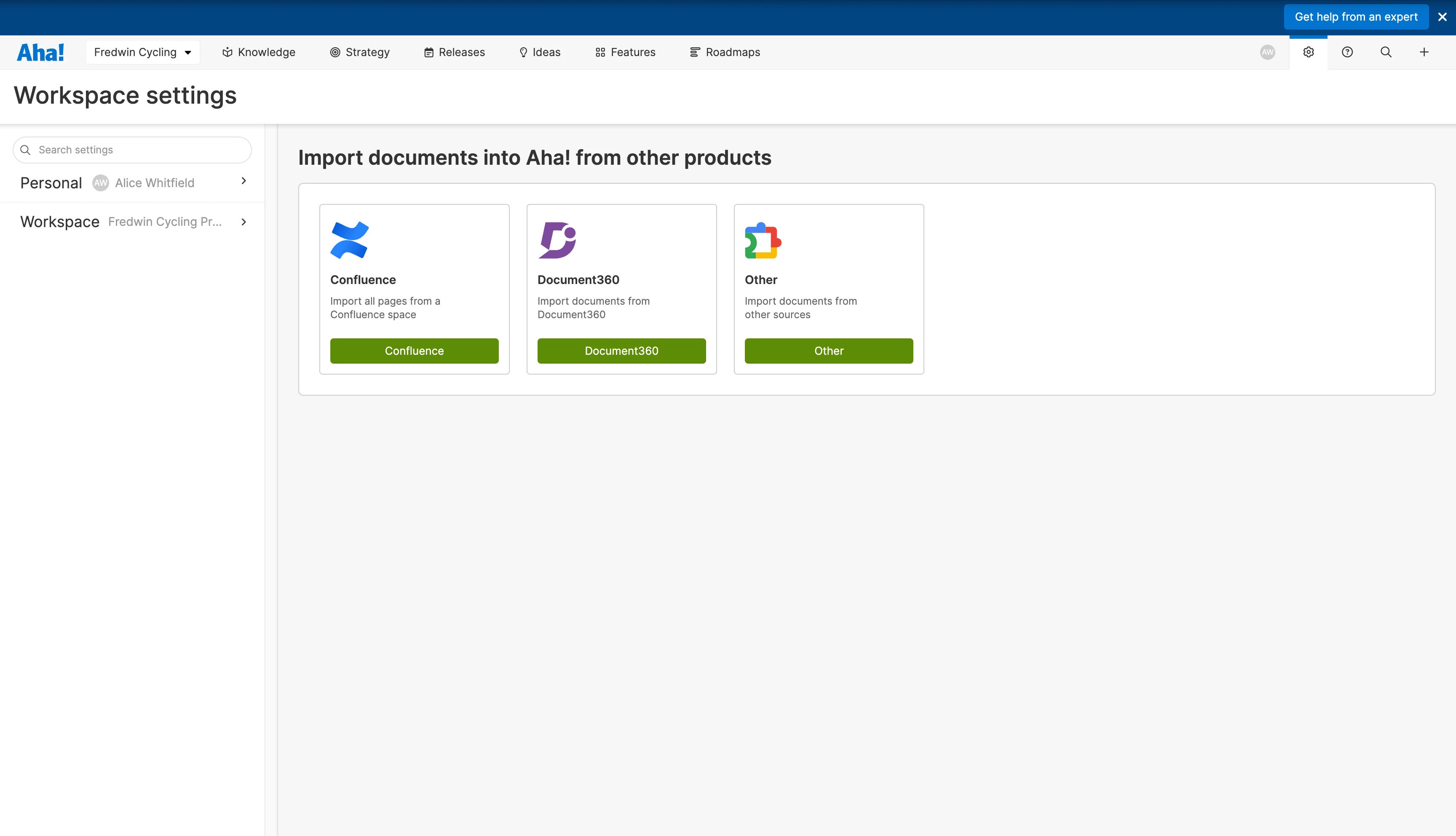 Jump-start your product knowledge base. Install the Aha! Knowledge importer from the Chrome Web Store. Then, quickly import documentation from other web-based tools (such as Document360) into your Aha! Roadmaps, Aha! Ideas, Aha! Knowledge, or Aha! Develop account. This makes it easy to centralize everything in one place — so you can make product resources readily accessible to customers and colleagues.