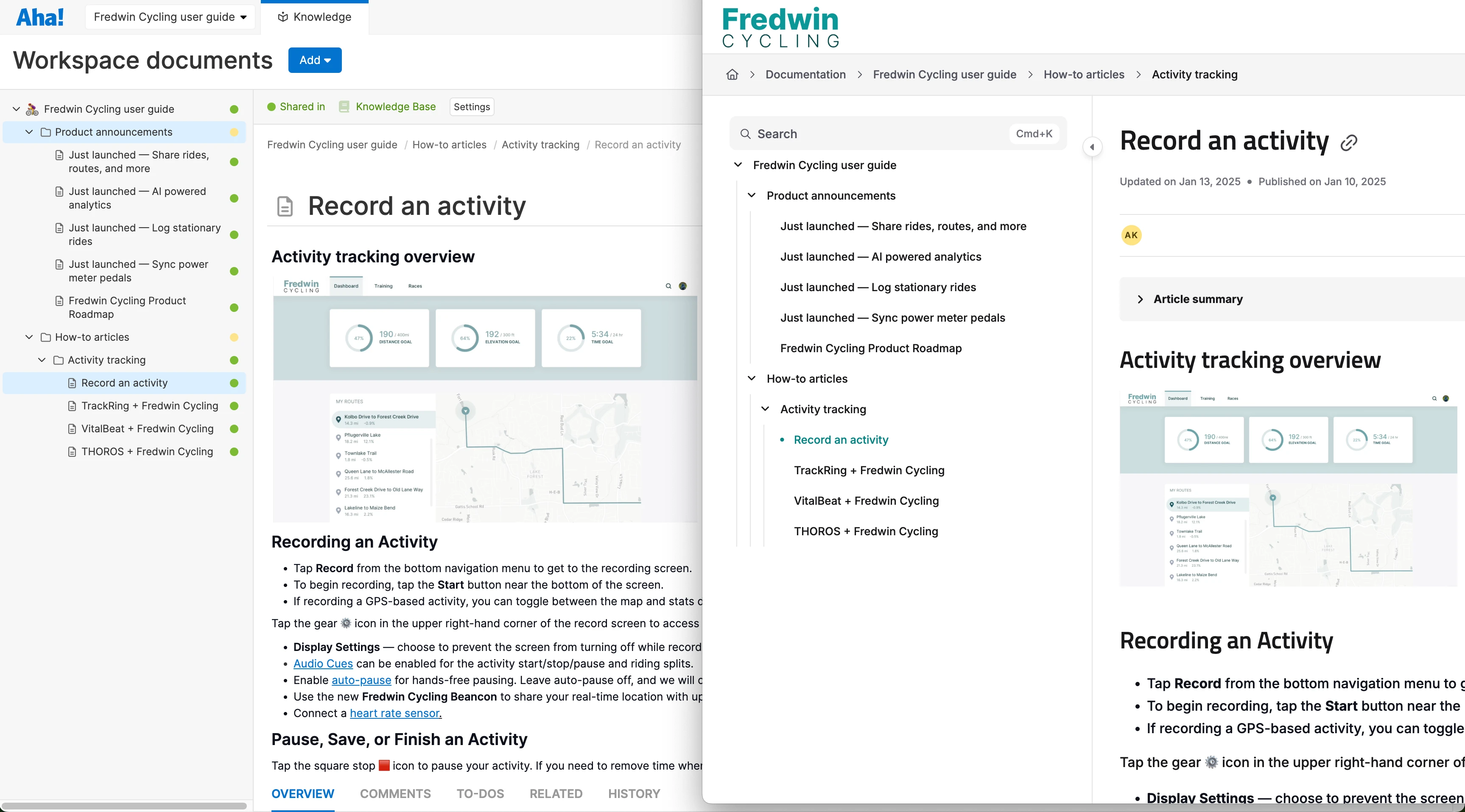 Make all your product resources available in one place. Easily create new documents, include visual diagrams, and collaborate with your team in real time. With the Aha! Knowledge Advanced plan, you can also publish content through self-serve knowledge bases to simplify how you share information with customers and colleagues.