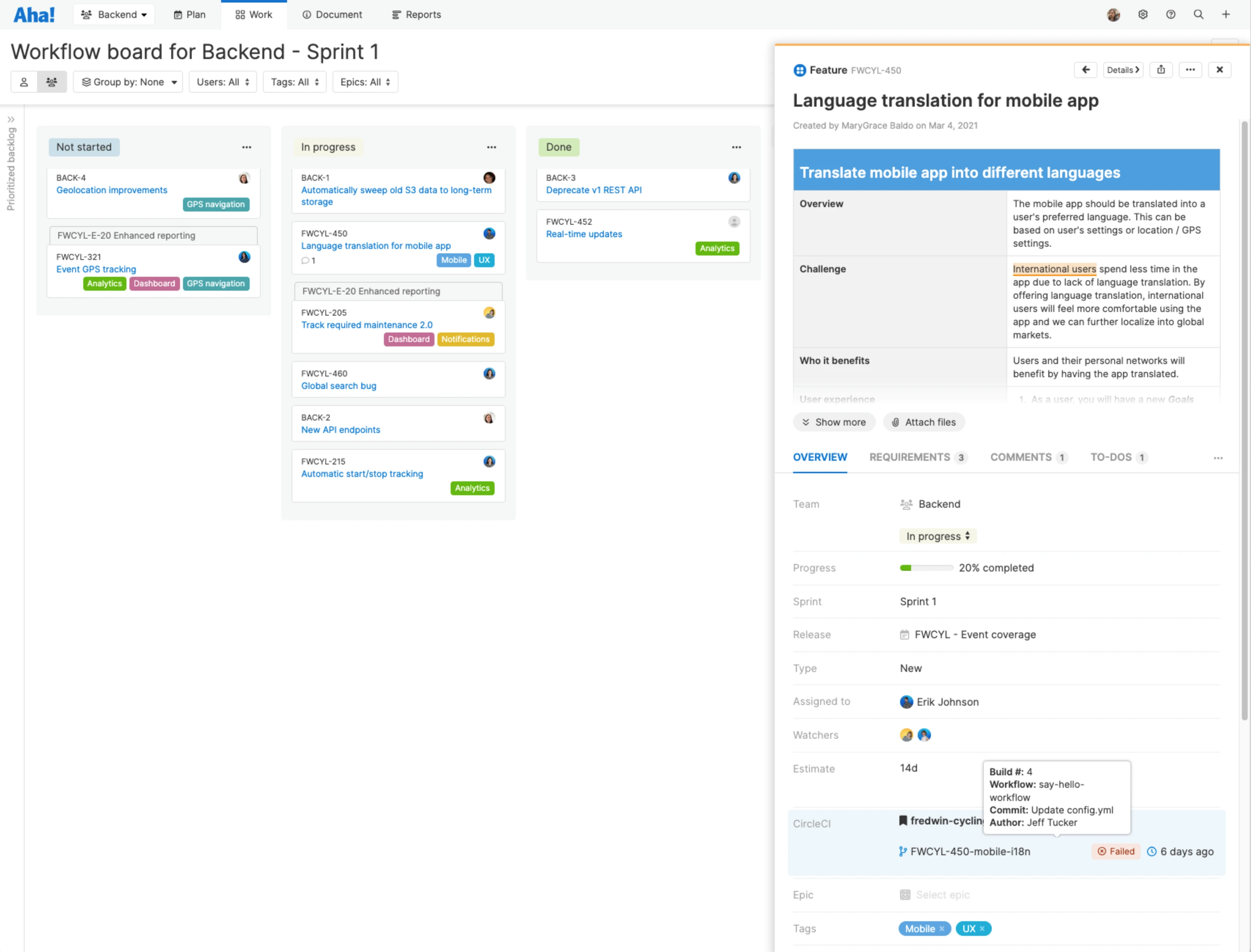 Connect user stories in Aha! Develop with their builds in CircleCI. Include the Aha! reference number in your branch name or commit message. When you kick off a new build (either in your source code management tool or directly in CircleCI), it will automatically link to your user story in Aha! Develop. The team can quickly see whether the most recent build passed or failed without leaving Aha! Develop.