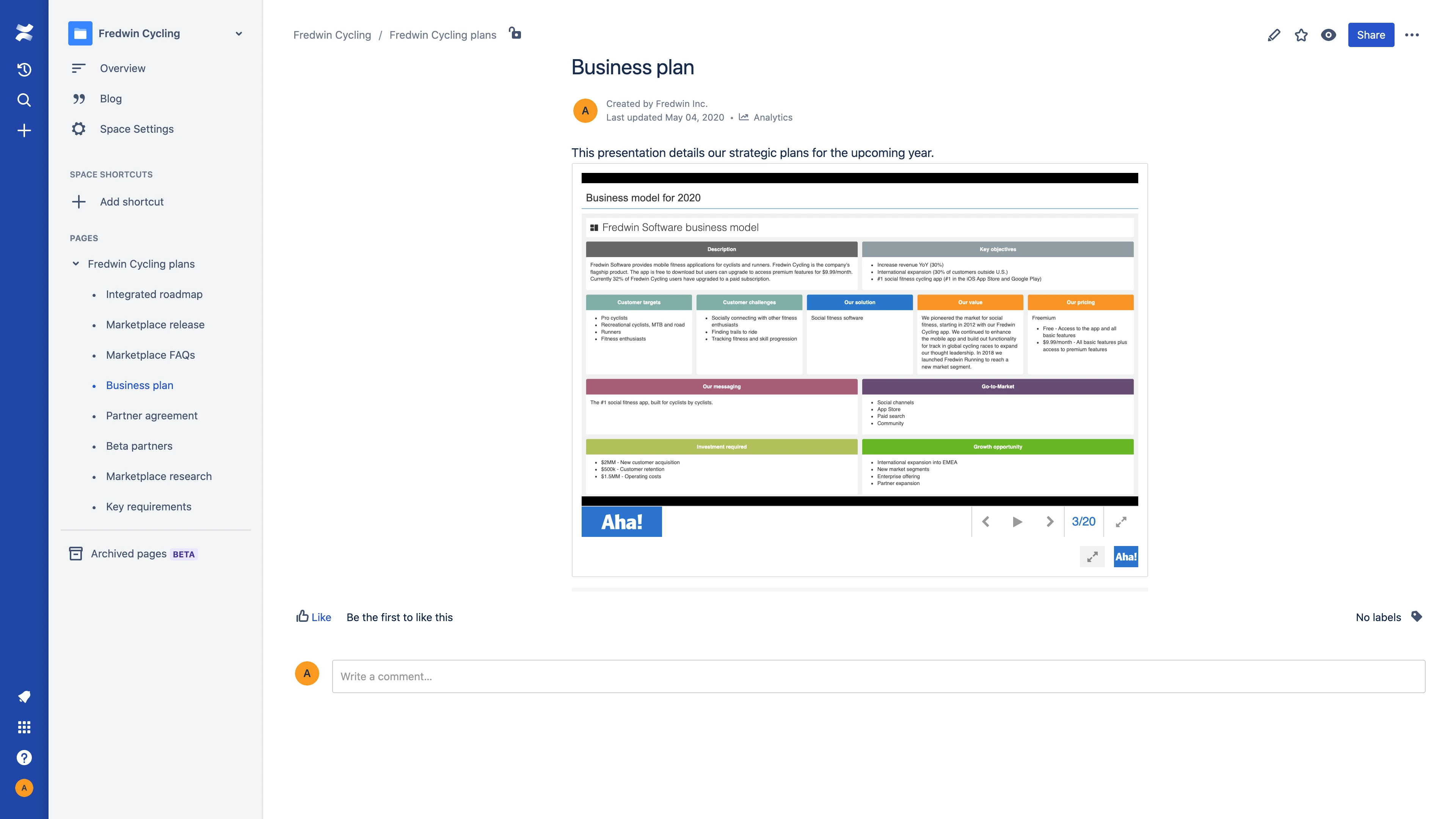 Set strategy, define plans, and build visual roadmaps in Aha! Roadmaps. Then, use the Confluence integration to make those plans even more accessible across your organization. Showcase any presentation, roadmap, or report as a live view on a Confluence page. As your plans progress in Aha! Roadmaps, the data on the corresponding Confluence page updates automatically — so you can give everyone real-time visibility into what is happening.