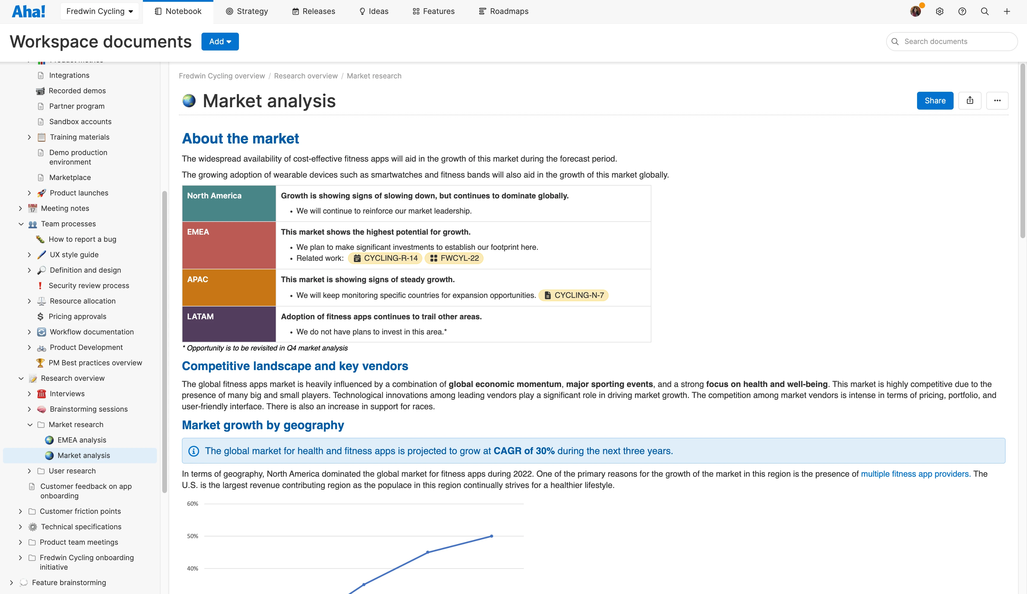 For instance, our own team centralizes product documentation in a shared place in Aha! Notebooks. We have folders for established processes as well as notes on current strategy and weekly team meetings. But it is not just a repository of recent happenings. In a real way it is more like our worldview of how products get built at Aha! — how we make decisions, work together, and deliver value to customers.