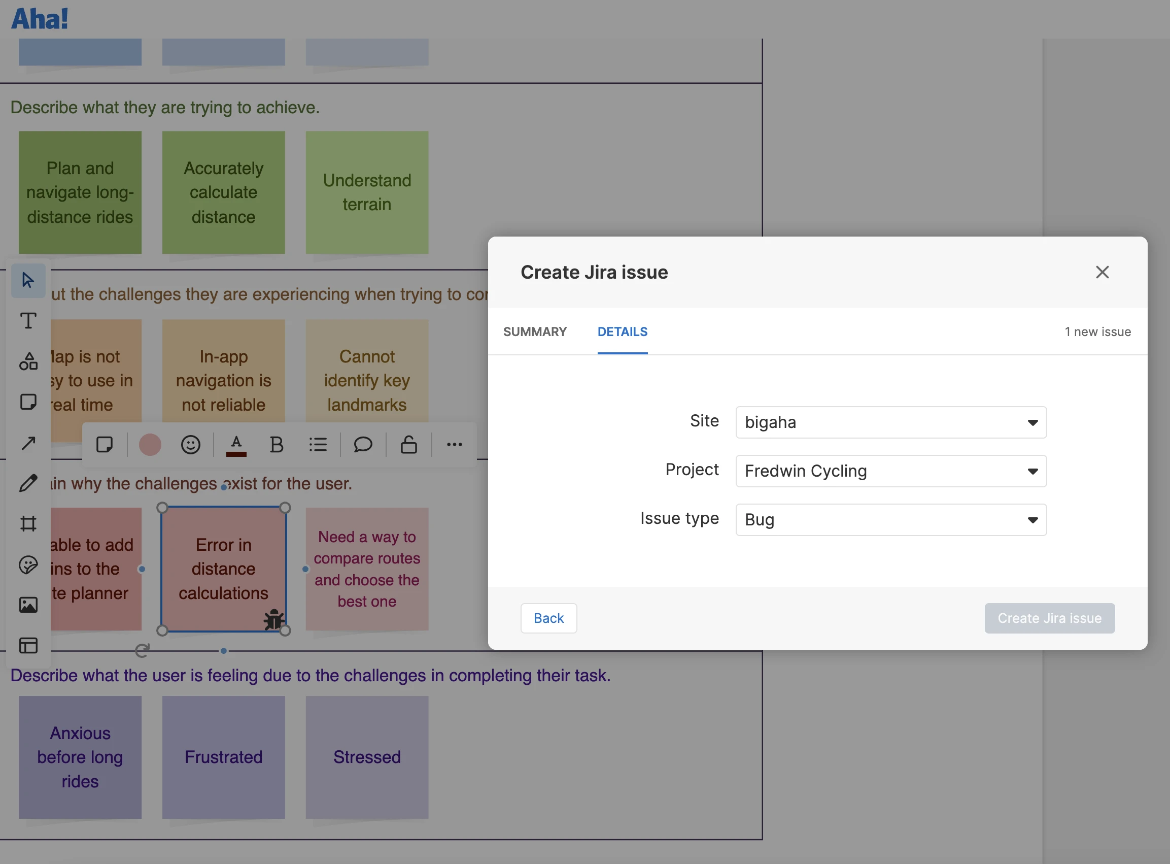 Refine delivery plans using Aha! Whiteboards and Jira together. Add existing Jira issues to a whiteboard, moving items around freely as you discuss priorities and timing. You can also create new Jira issues from a whiteboard. This is a great way to send newly identified technical items that you do not want on your product roadmap directly to the engineering team's backlog.