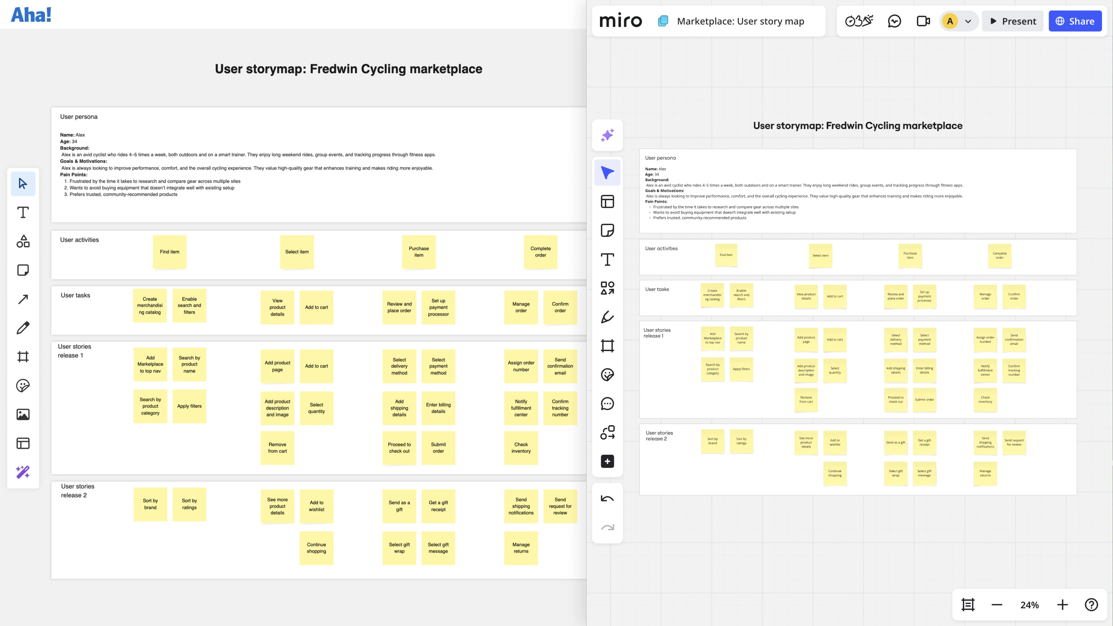 Explore early concepts in the same product development software you use to plan, build, and deliver new functionality. Use the Miro importer to quickly bring existing whiteboards into your Aha! Roadmaps, Aha! Whiteboards, Aha! Ideas, Aha! Knowledge, or Aha! Develop account. Then, use the powerful whiteboarding capabilities built into Aha! software to go seamlessly from conceptualizing plans to implementing them.