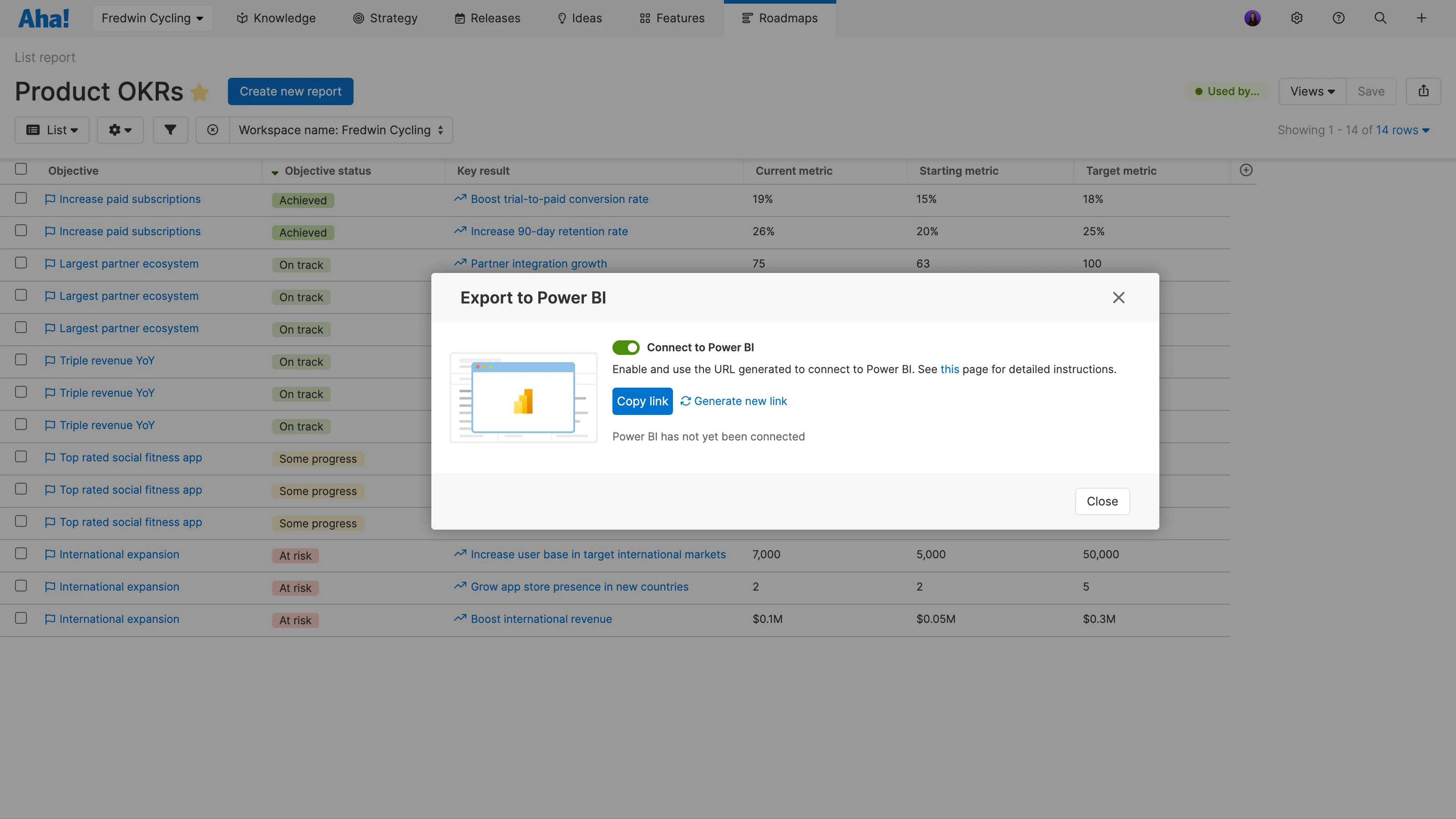 Take your business analysis to the next level by including your product data from Aha! Roadmaps alongside data from other sources. Start by building a list report in Aha! Roadmaps with the key information you want to export — like initiatives, releases, or OKRs. Then, quickly generate a link you will use to share the data with Power BI.
